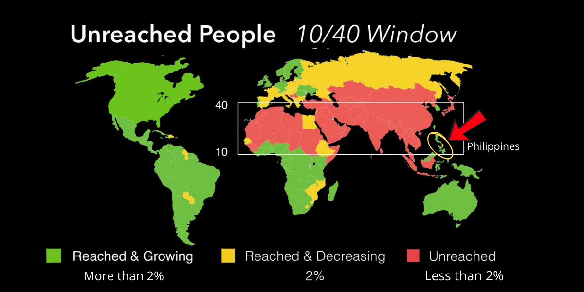 In January 2024, Pastor Trent and a team from CCSG traveled to the Philippines to teach The Purpose of the Church at CBI, ministering not only to students but also to pastors and church planters from the surrounding region. During that time, God impressed upon Trent the unique strategic importance of the Philippines. Positioned on the edge of the 10/40 Window—the region containing the majority of the world’s unreached people groups—the Philippines stands as a gateway into South Asia and Southeast Asia. (See the attached map for reference: the Philippines rests at the edge of the red block, making it an ideal launching point for the gospel into unreached nations.)